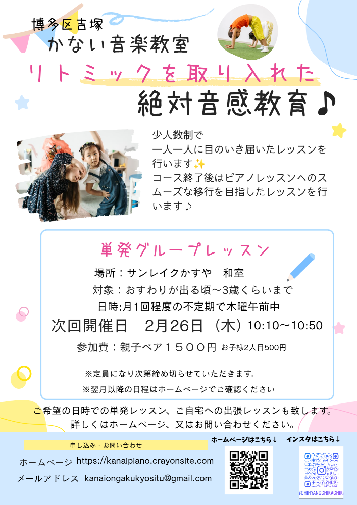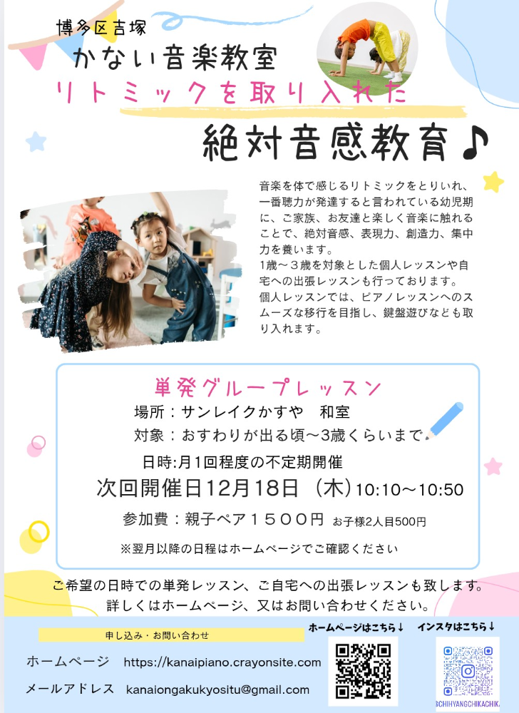 | 教室名 | 博多区吉塚かない音楽教室 ピアノ・リトミック |